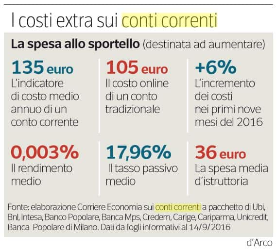 Rendimenti ormai del tutto azzerati, ma continui incrementi dei costi sui conti correnti bancari.
