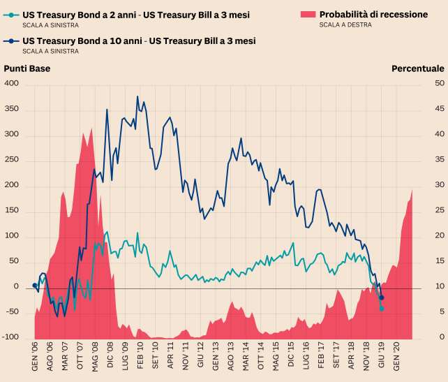 I segnali che arrivano dai mercati finanziari sono preoccupanti: dallo scorso marzo la curva dei rendimenti sui titoli di Stato americani è invertita, con i rendimenti a 3 mesi sopra quelli a due e persino a dieci anni.