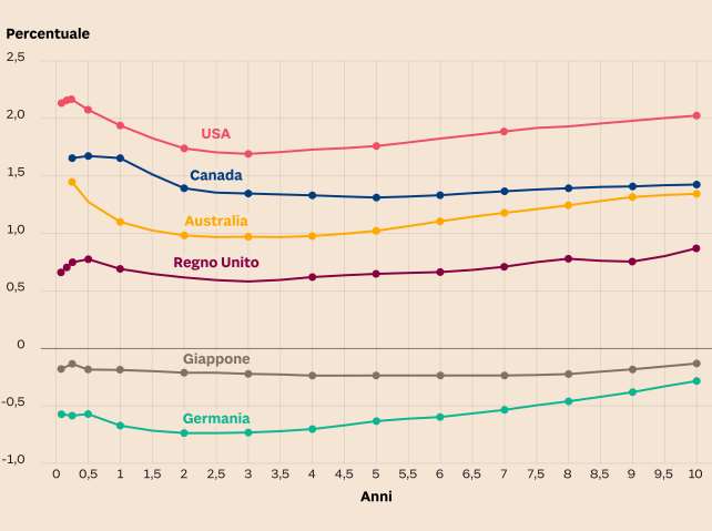 Oggi le curve dei rendimenti sui titoli di Stato delle principali aree valutarie si somigliano tutte: USA, Regno Unito, Australia, Canada, Germania, Giappone. Sono tutte invertite o quantomeno molto appiattite.